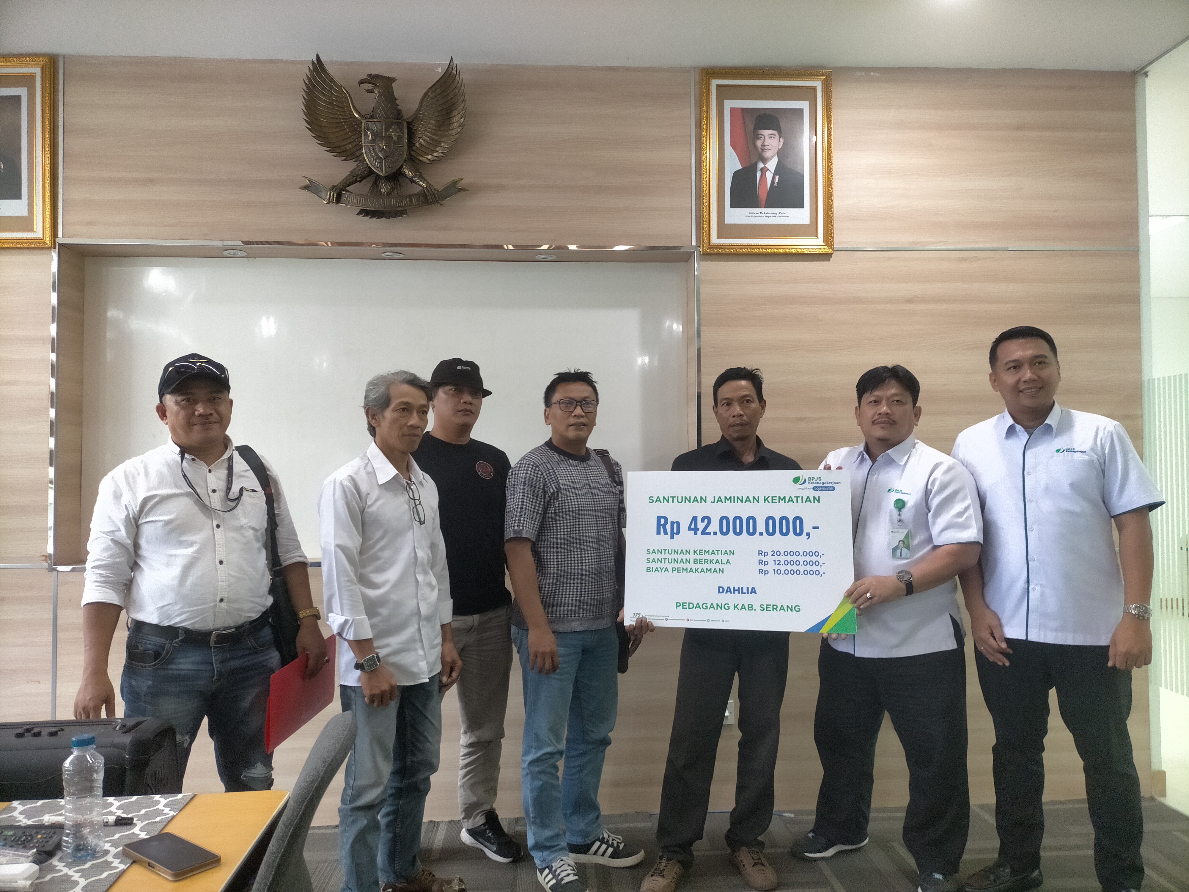 SERANG, (haluanbanten.co.id) – BPJS Ketenagakerjaan (BPJAMSOSTEK) Cabang Serang serahkan santunan Jaminan Kematian (JKM) sebesar Rp 42 Juta kepada peserta pekerja informal atau pedagang di Kabupaten Serang yang meninggal dunia.