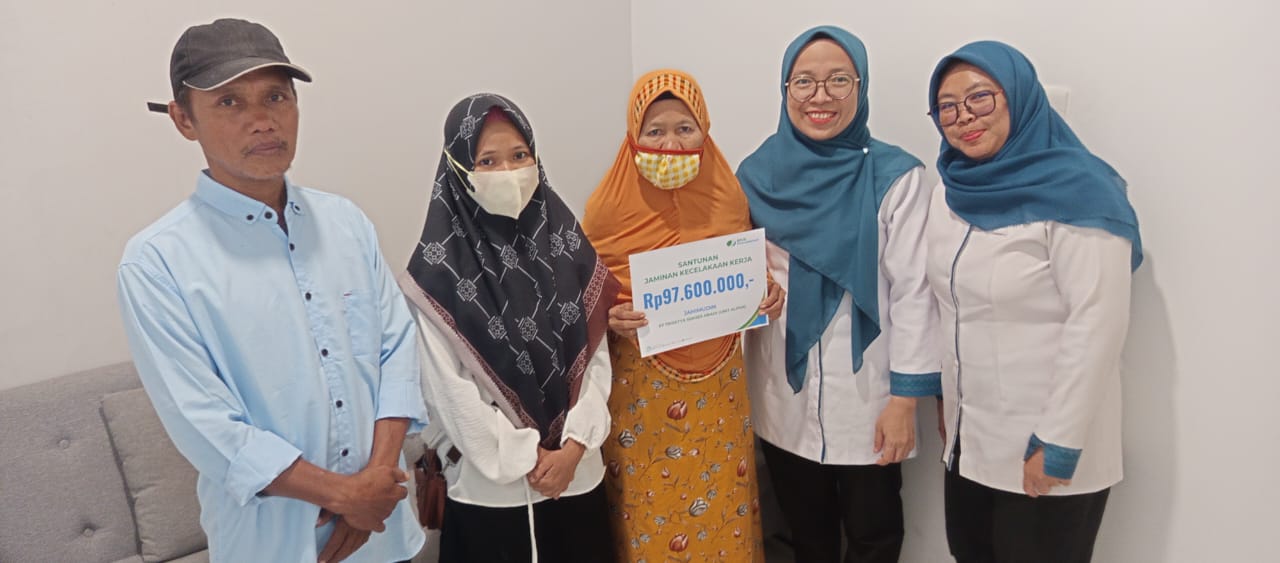 Penyerahan santunan JKK tersebut diserahkan langsung oleh Trihastuti Wijayanti selaku Kepala Bidang Pelayanan BPJS Ketenagakerjaan Cabang Tangerang Cimone kepada Sarmunah Ibu dari Almarhum Jahimudin.