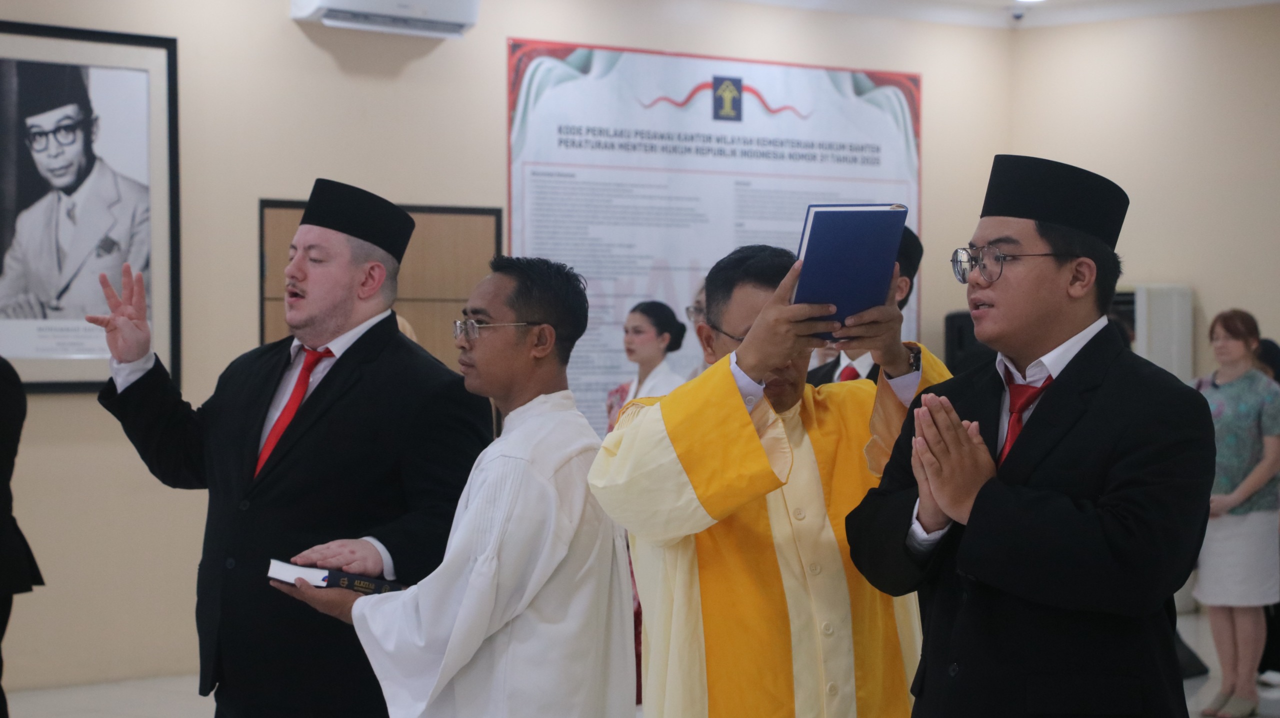 SERANG, (Haluanbanten.co.id) – Kepala Kantor Wilayah Kementerian Hukum Banten, Pagar Butar Butar, secara resmi memimpin upacara pengambilan sumpah dan janji setia pewarganegaraan Republik Indonesia serta pelantikan Notaris Pengganti di wilayah kerja Provinsi Banten, Senin (13/04/2026).